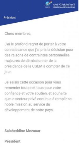 قال صلاح الدين مزوار، رئيس الاتحاد العام لمقاولات المغرب أنه قدم استقالته من هذا المنصب اليوم الأحد 13 أكتوبر الجاري لأسباب قاهرة