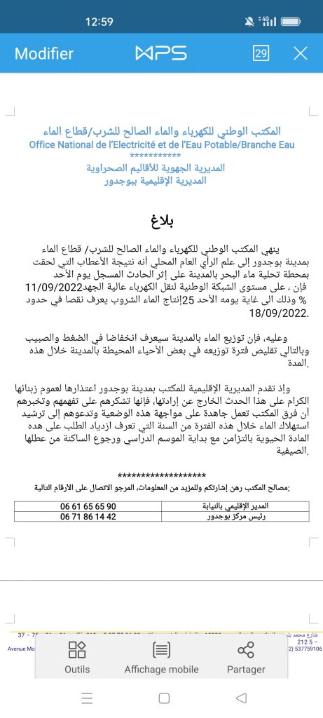 وتقدم المديرية الإقليمية للمكتب بمدينة بوجدور في البلاغ اعتذارها لعموم زبنائها على هذا الحدث الخارج عن إرادتها، وتخبر الساكنة أن فرق المكتب تعمل جاهدة على مواجهة هذه الوضعية وتدعوهم إلى ترشيد استهلاك الماء خلال هذه الفترة من السنة التي تعرف ازدياد الطلب على هده المادة الحيوية بالتزامن مع بداية الموسم الدراسي ورجوع الساكنة من عطلها الصيفية.