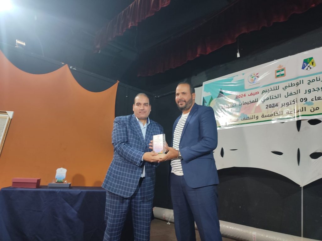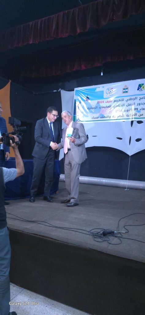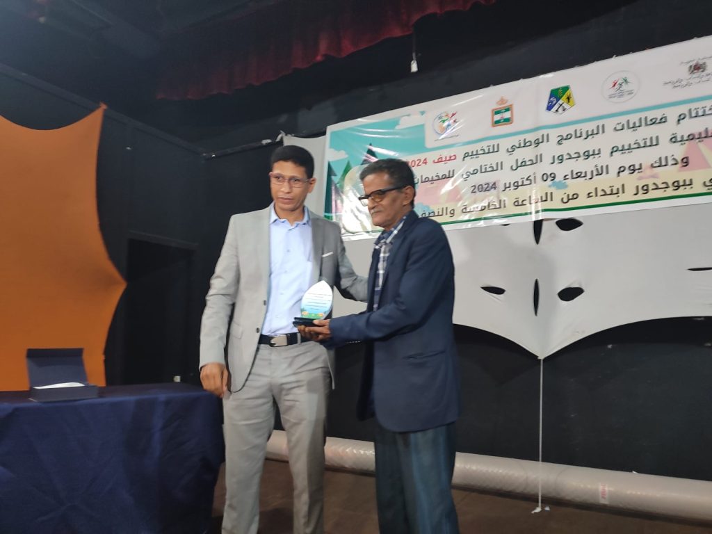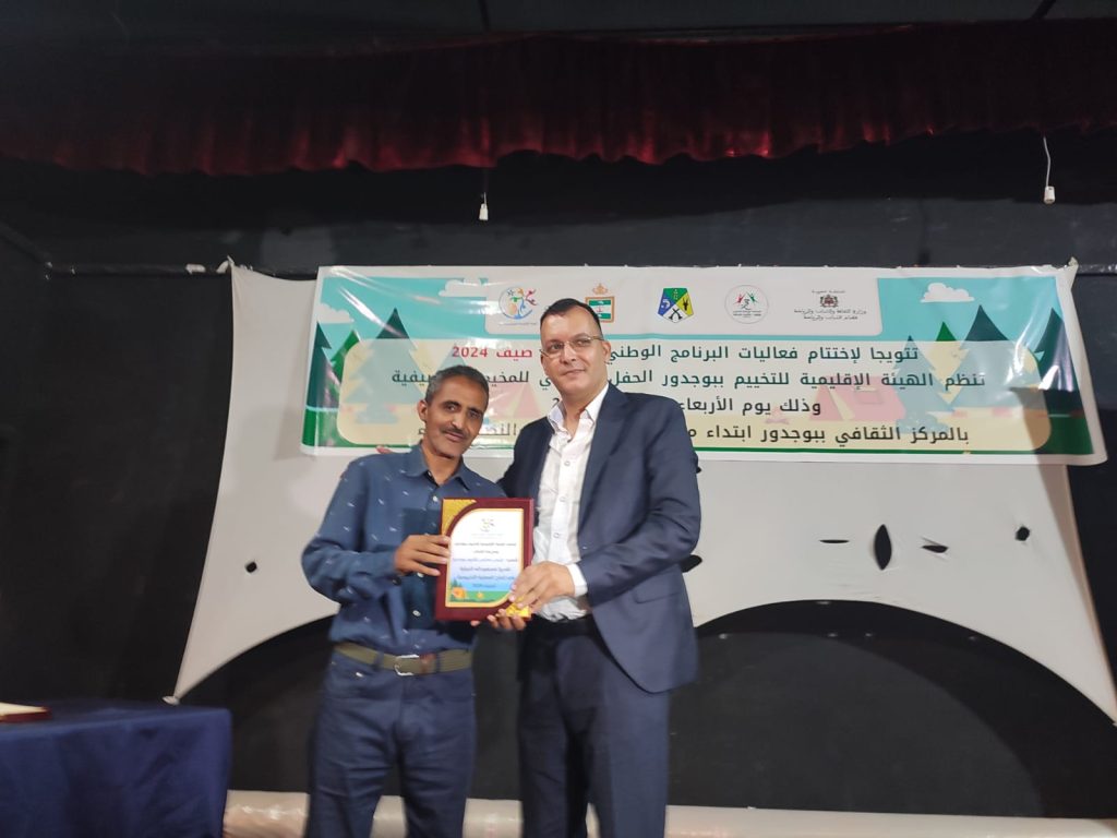 واعترافا بالمحهودات الجبارة التي قدمها من أجل إنجاح العملية التخييمية لصيف 2024 ، حيث تم تكريم السيد عامل إقليم بوجدور والسيد رئيس المجلس الإقليمي لبوجدور والمدير الإقليمي لوزارة الشباب ببوجدور والمدير العام للمصالح بالمجلس الإقليمي لبوجدور ، كما تم تكريم ناجم ركدو المسؤول الإقليمي للشباب بالمديرية الإقليمة لوزارة الشباب ببوجدور الذي أحيل على التقاعد مؤخرا .
