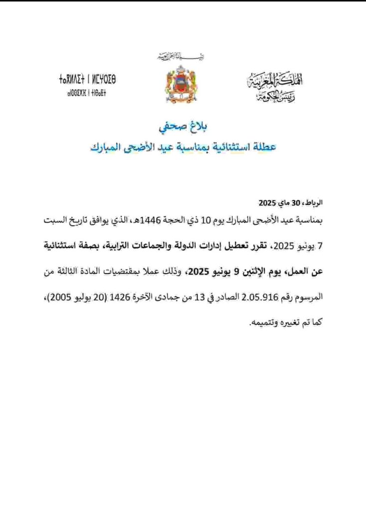 بمناسبة عيد الأضحى المبارك، قررت الحكومة تعطيل إدارات الدولة والجماعات الترابية، بصفة استثنائية عن العمل، يوم الإثنين 9 يونيو 2025.
