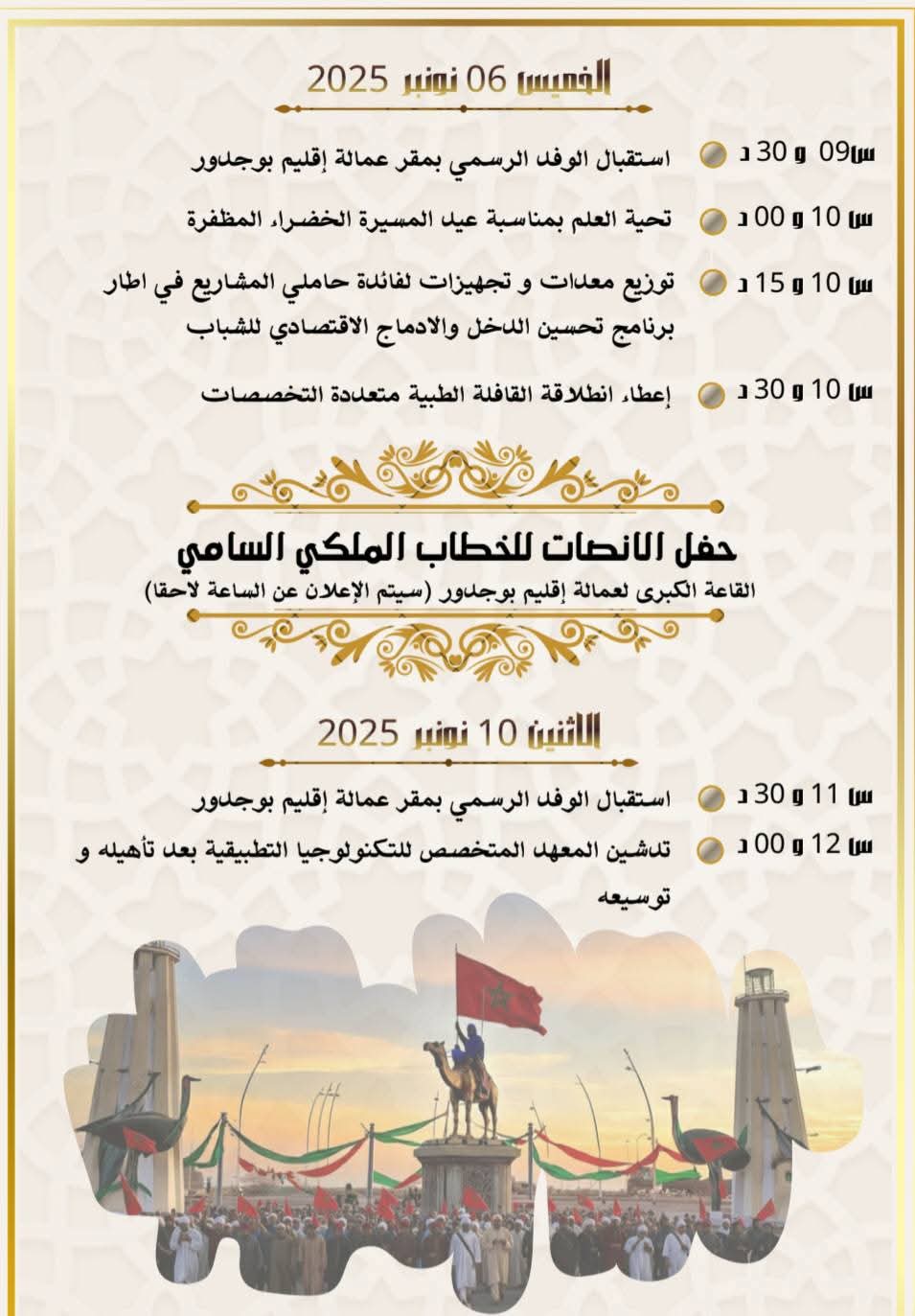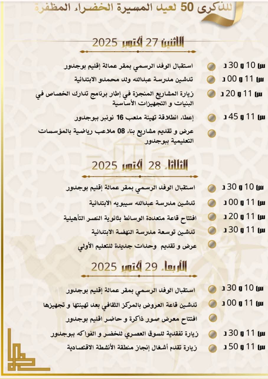 حيث تستعد مدينة بوجدور هذه الأيام لإحياء الذكرى الخمسينية للمسيرة الخضراء المظفرة، مناسبة وطنية تحمل رمزية عميقة وتعكس الانتماء للعرش المجيد. وتأتي هذه الاحتفالات في وقت تشهد فيه المدينة تقدمًا ملموسًا على صعيد التنمية المحلية، ما يجعل الحدث أكثر شمولية وعمقًا.