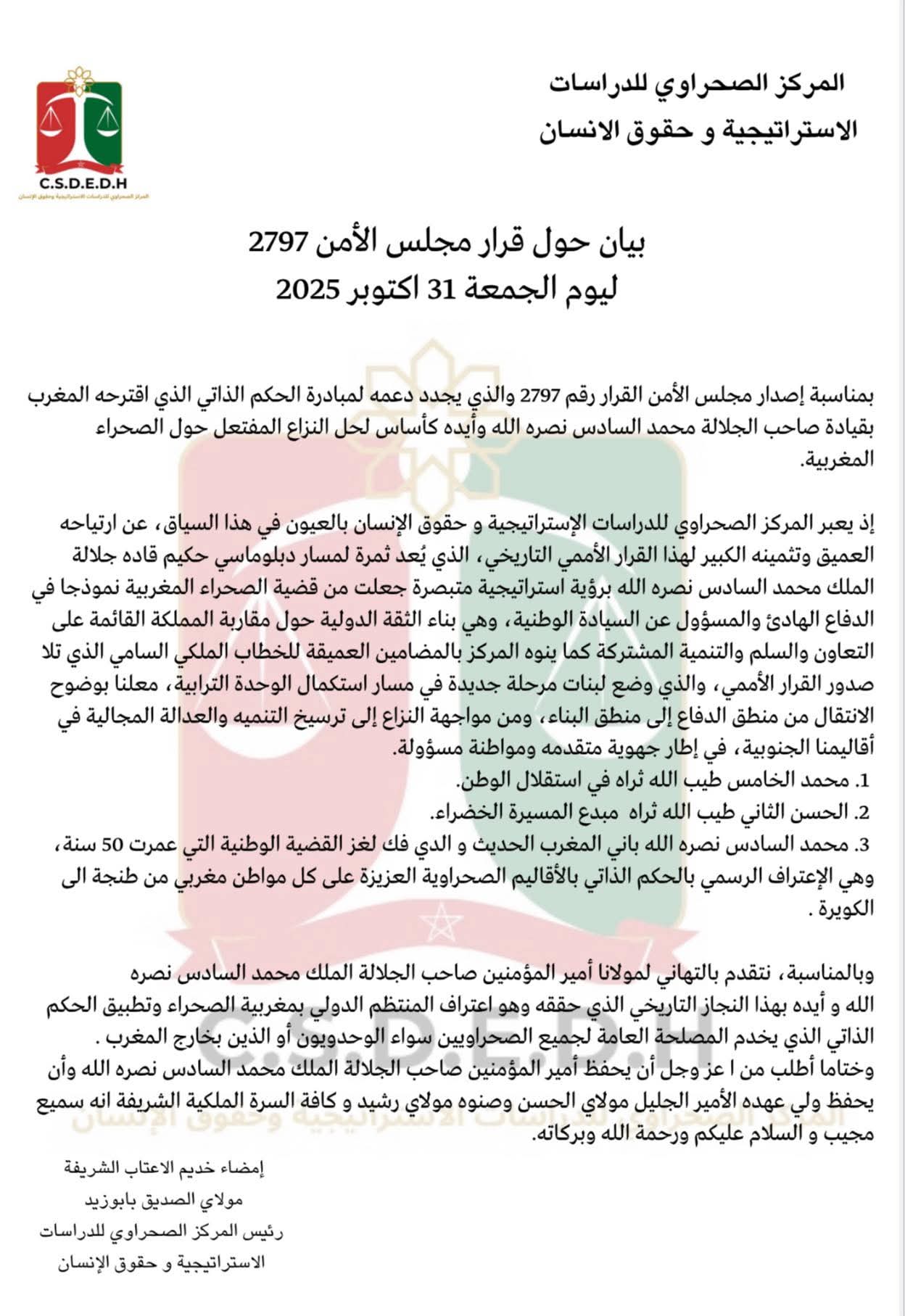 اصدر المركز الصحراوي للدراسات الإستراتيجية و حقوق الإنسان بالعيون بيانا يعبر فيه ، عن ارتياحه العميق وتثمينه الكبير لهذا القرار الأممي التاريخي، والذي يُعد ثمرة لمسار دبلوماسي حكيم قاده جلالة الملك محمد السادس نصره الله برؤية استراتيجية متبصرة جعلت من قضية الصحراء المغربية نموذجا في الدفاع الهادئ والمسؤول عن السيادة الوطنية حسب البيان ، هي بناء الثقة الدولية حول مقاربة المملكة القائمة على التعاون والسلم والتنمية المشتركة كما ينوه المركز بالمضامين العميقة للخطاب الملكي السامي الذي تلا صدور القرار الأممي، والذي وضع لبنات مرحلة جديدة في مسار استكمال الوحدة الترابية، معلنا بوضوح الانتقال من منطق الدفاع إلى منطق البناء، ومن مواجهة النزاع إلى ترسيخ التنميه والعدالة المجالية في أقاليمنا الجنوبية، في إطار جهوية متقدمه ومواطنة مسؤولة.