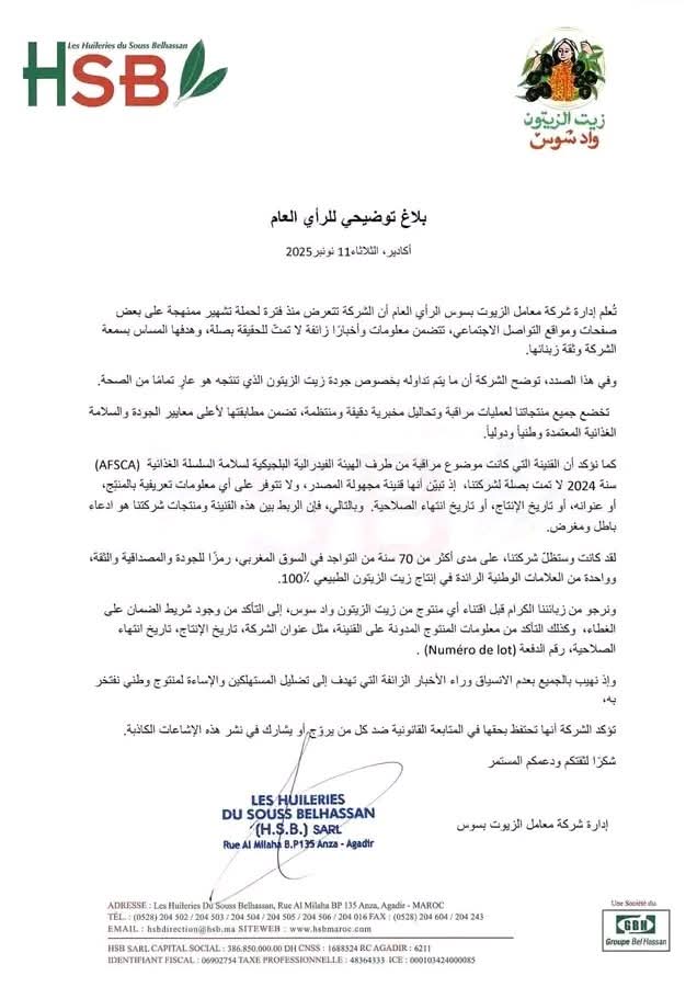 وأبرز البلاغ أن الشركة، التي راكمت أكثر من سبعين سنة من الخبرة في السوق المغربي، ستظل رمزًا للجودة والالتزام، وواحدة من أبرز العلامات الوطنية في إنتاج زيت الزيتون الطبيعي بنسبة 100%، مشيرة إلى أن كل قنينة أصلية من إنتاجها تحمل شريط الضمان على الغطاء، بالإضافة إلى بيانات واضحة تشمل عنوان الشركة، وتاريخ الإنتاج، وتاريخ انتهاء الصلاحية، ورقم الدفعة (Numéro de lot) الذي يتيح تتبع كل منتوج بدقة من المصنع إلى المستهلك.