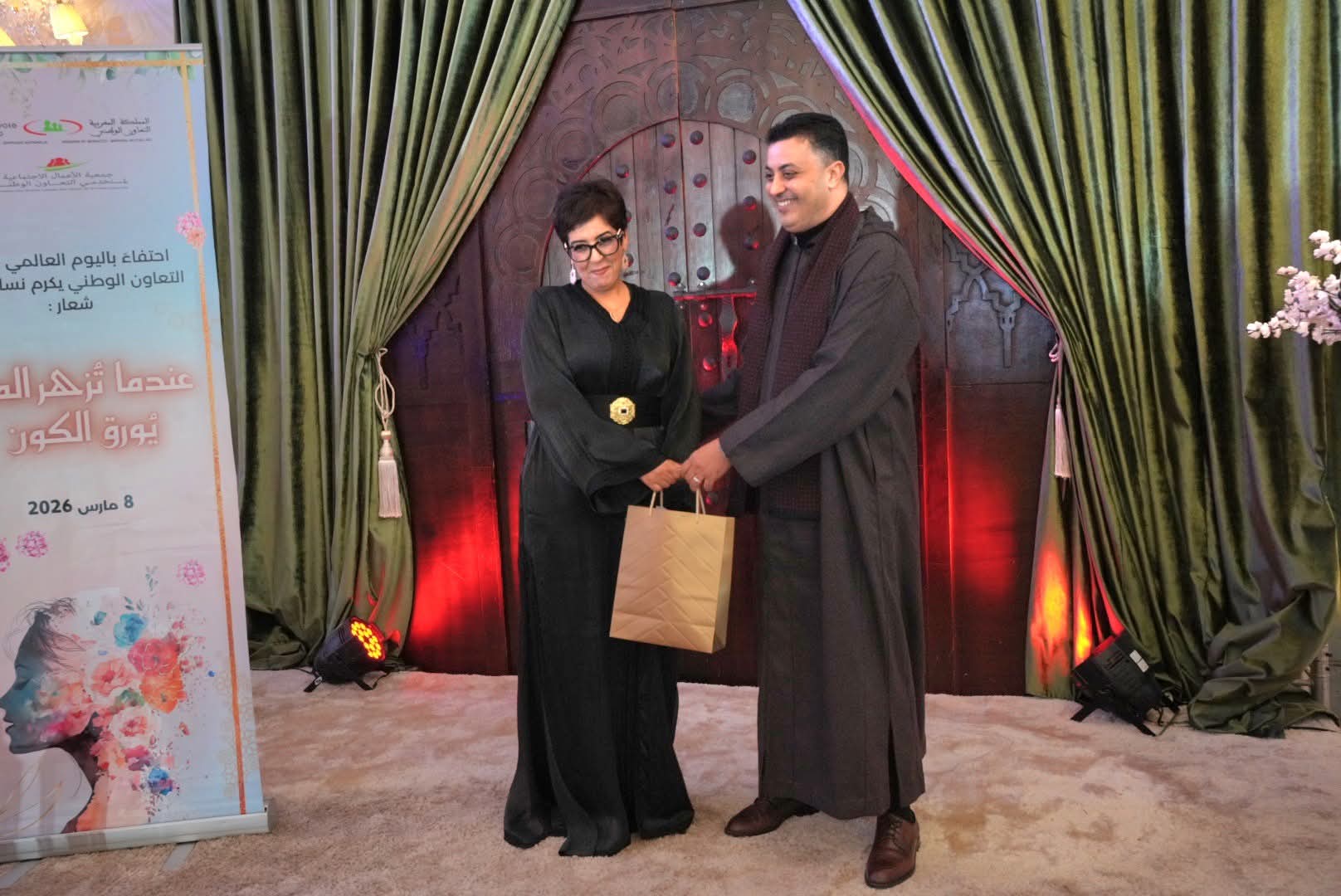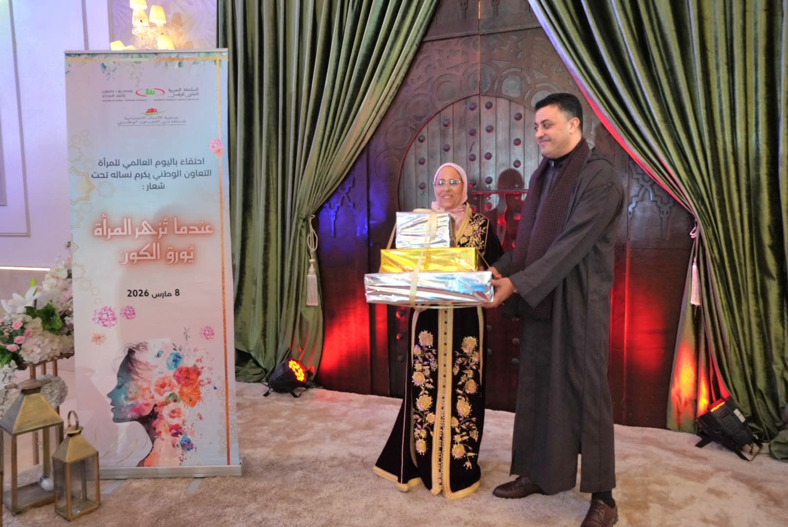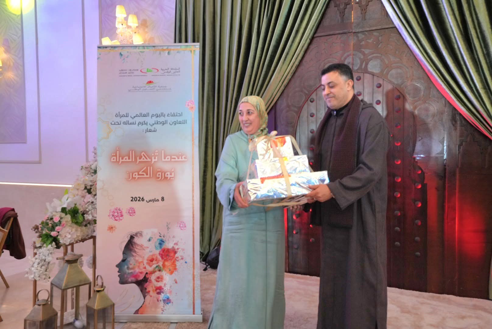 وقد أشرف المجاهدي مدير التعاون الوطني على إعطاء جوائز تكريمية عرفانا بالعطاء النسائي، وبمجهودات نسوة مقبلات على التقاعد أبلين البلاء الحسن في مسار مهني كله إخلاص، وانخراط في خدمة العمل الاجتماعي والتضامني. وقد تخللت هذه الأمسية الراقية التي سهر على إنجاحها أطر وأعضاء بجمعية الأعمال الاجتماعية للمؤسسة، فقرات فنية متنوعة من المديح، و وازدانت بمفاجئة إجراء قرعة رحلة العمرة للديار المقدسة والتي أسفرت عن اختيار فائزتين.
