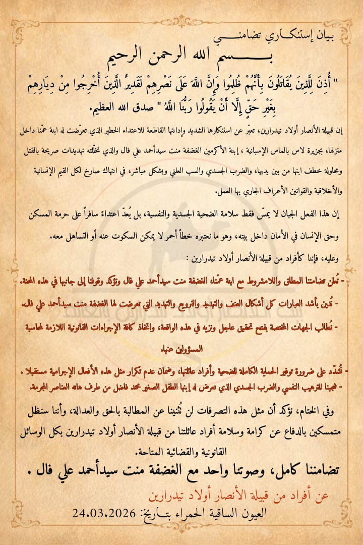 كما تشكر قبيلة الأنصار أولاد تيدرارين كافة المكونات الاجتماعية على تضامنها مع ابنة العم وعلى رأسهم قبيلة الشرفاء لعروسيين في موقف يعكس تلاحمًا قويًا ووحدة صف لا تتزعزع.